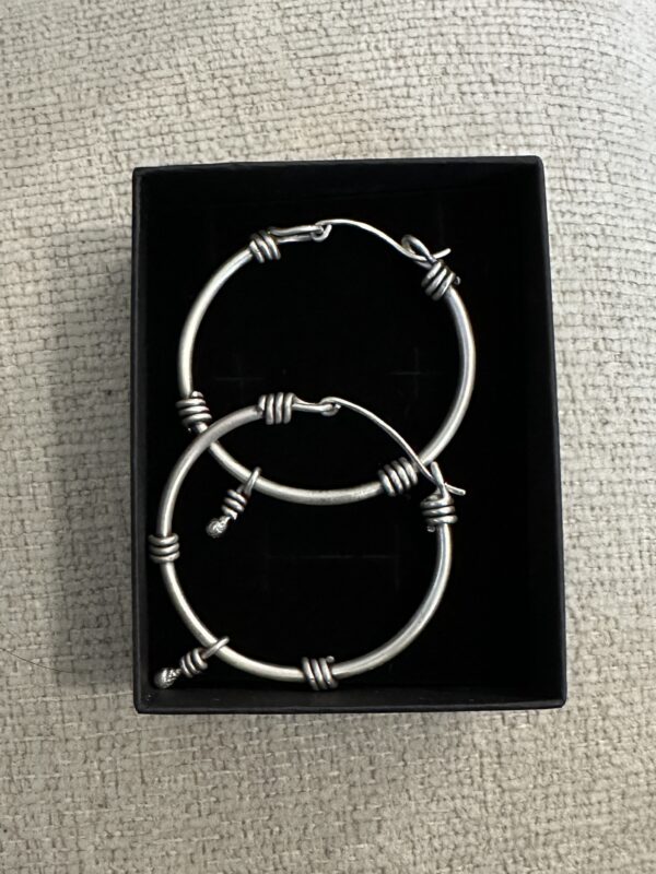 These sterling silver hoops are wrapped with silver coils in their four “corners,” and from the bottom of each drips a moondrop of shimmery silver providing movement and fluidity. These hoops measure about 1 3/4 inch in diameter.